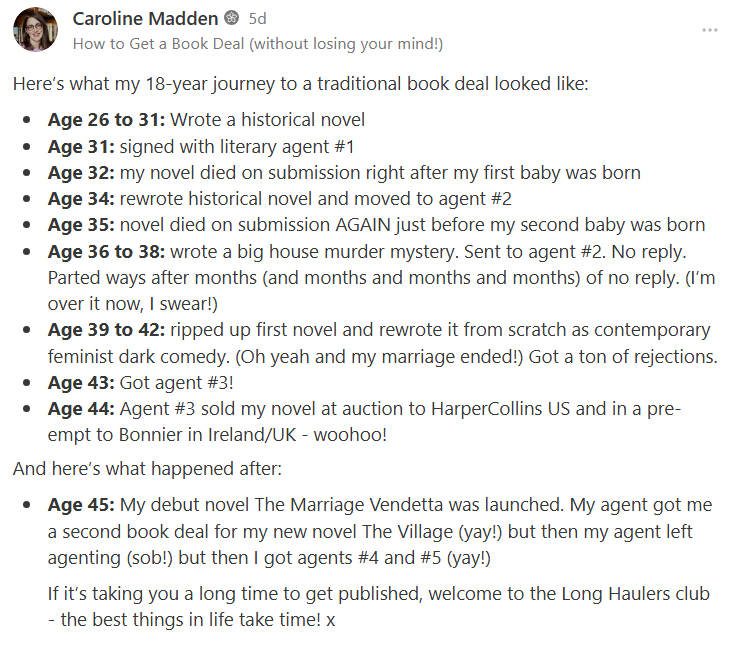 I’ve been genuinely touched this week by the response this little note 👇 has been getting on Substack. It’s a pretty stark (but hopefully ultimately uplifting!) summary of just how long it took me to get a traditional book deal for my novel. It was also a bit harrowing to summarise my life like this. Like, was I MAD? (Yes. The answer is yes.)